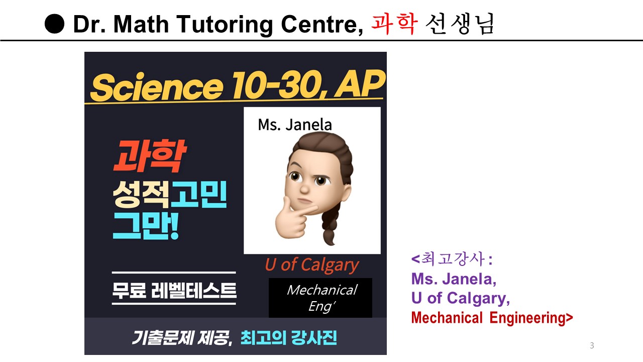 ● Dr. Math Tutoring 강사진 소개● 공학박사(Ph.D)외, 최강의 강사진 Dr. Math Tutoring Centre 캘거리, G9~12 고등과정 수학, 과학 전문 학원 Math, Calculus, Physics , Chem., Biology 10- 30, Ph.D., 외 최강의 4명 강사진,